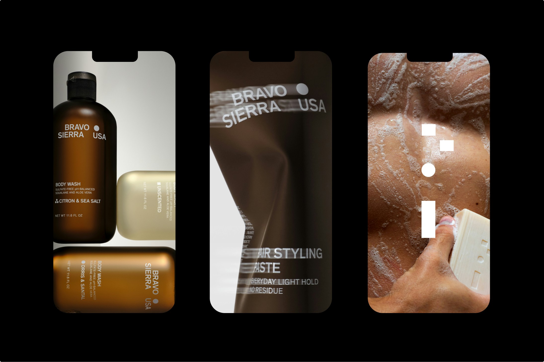 We fine-tuned every detail—adjusting the layout, refining packaging elements, enhancing colors, optimizing the information hierarchy, and carefully selecting new packs. To complement this shift, we crafted a visual imagery style that mirrors Bravo Sierra’s "No BS" ethos. Our approach was intentionally straightforward—no dramatic camera angles, no flying shampoo bottles—just clean, strict setups in classic studio lighting. This creates a bold yet understated presentation that reflects the brand’s essence: honest, simple, and effective.
