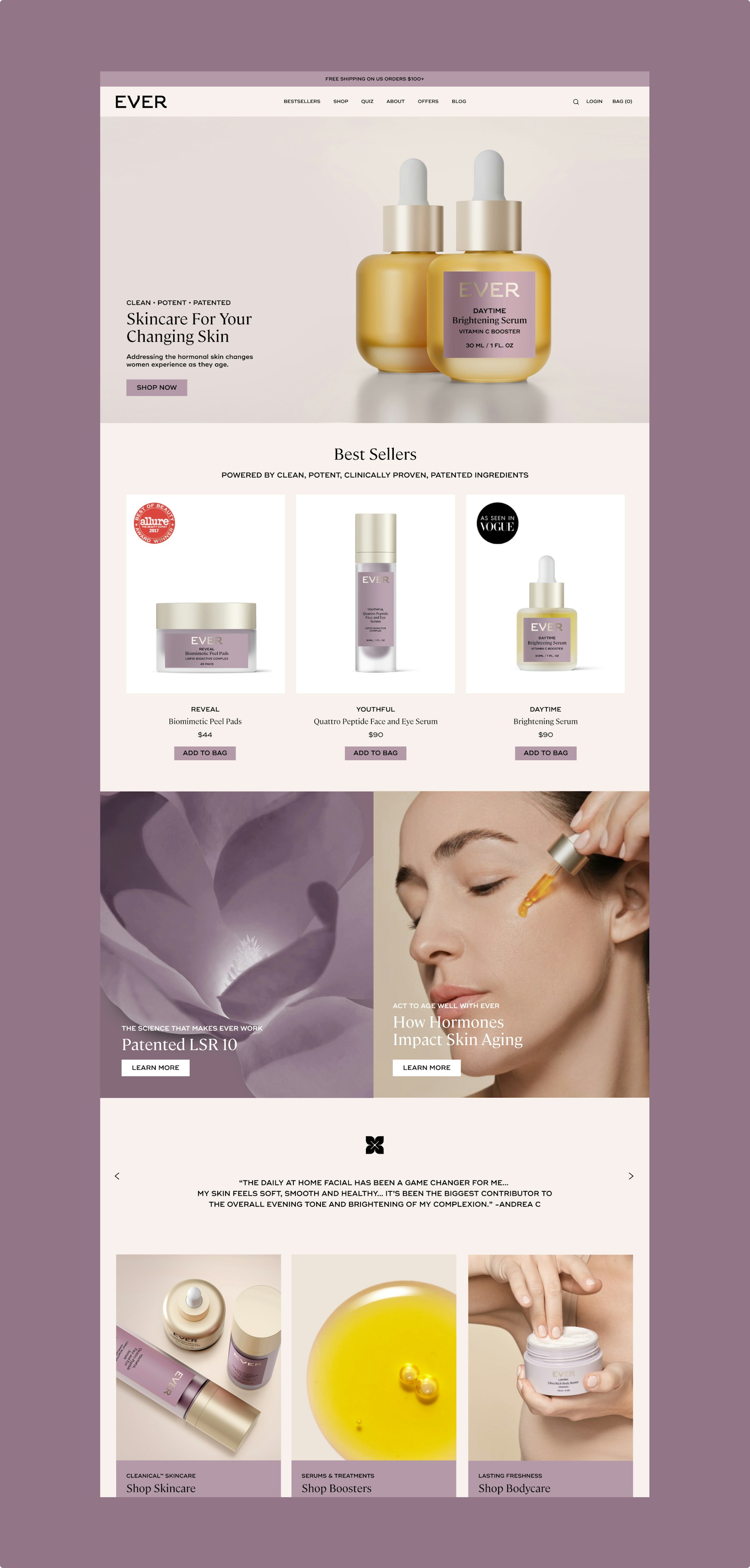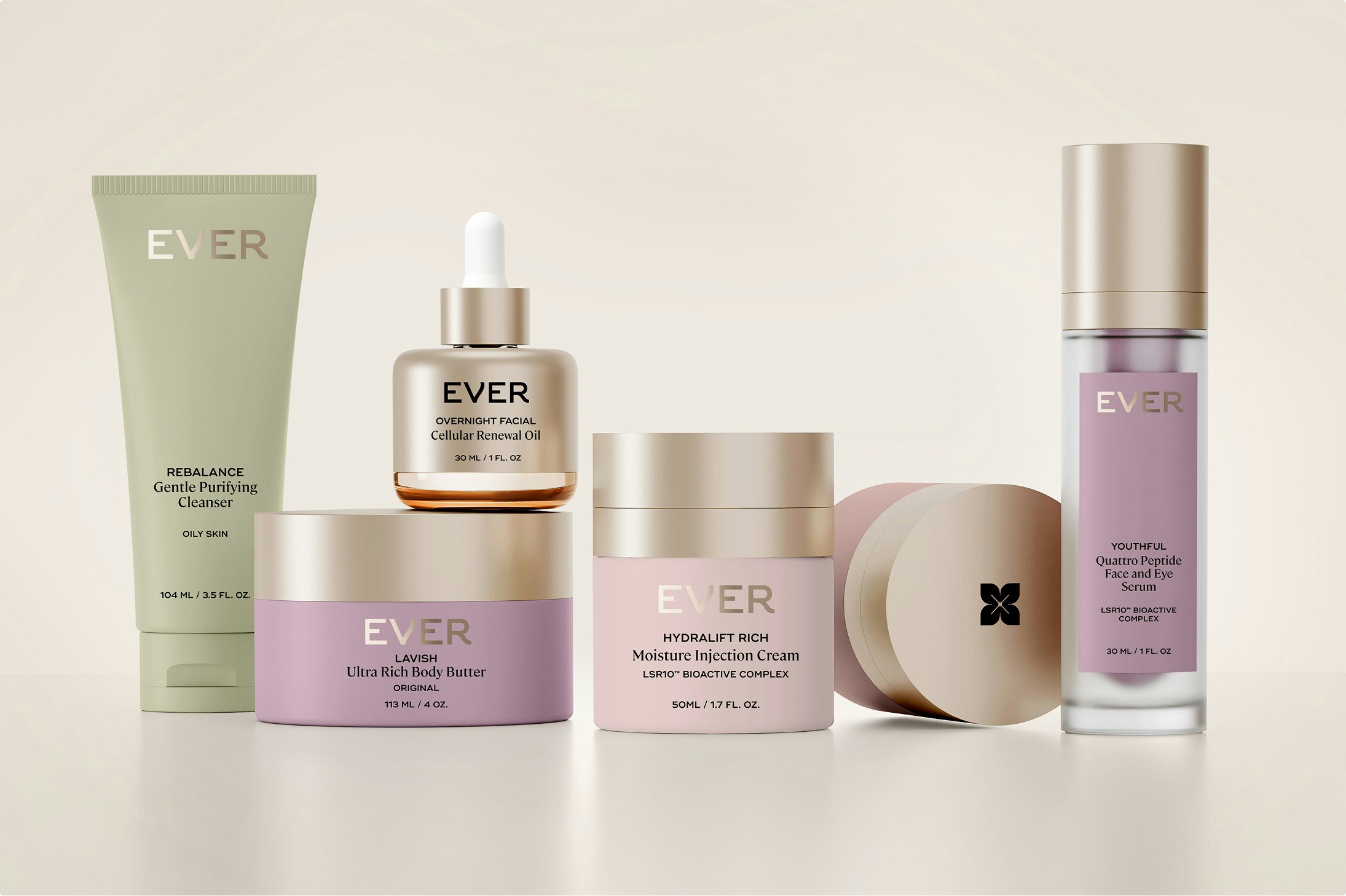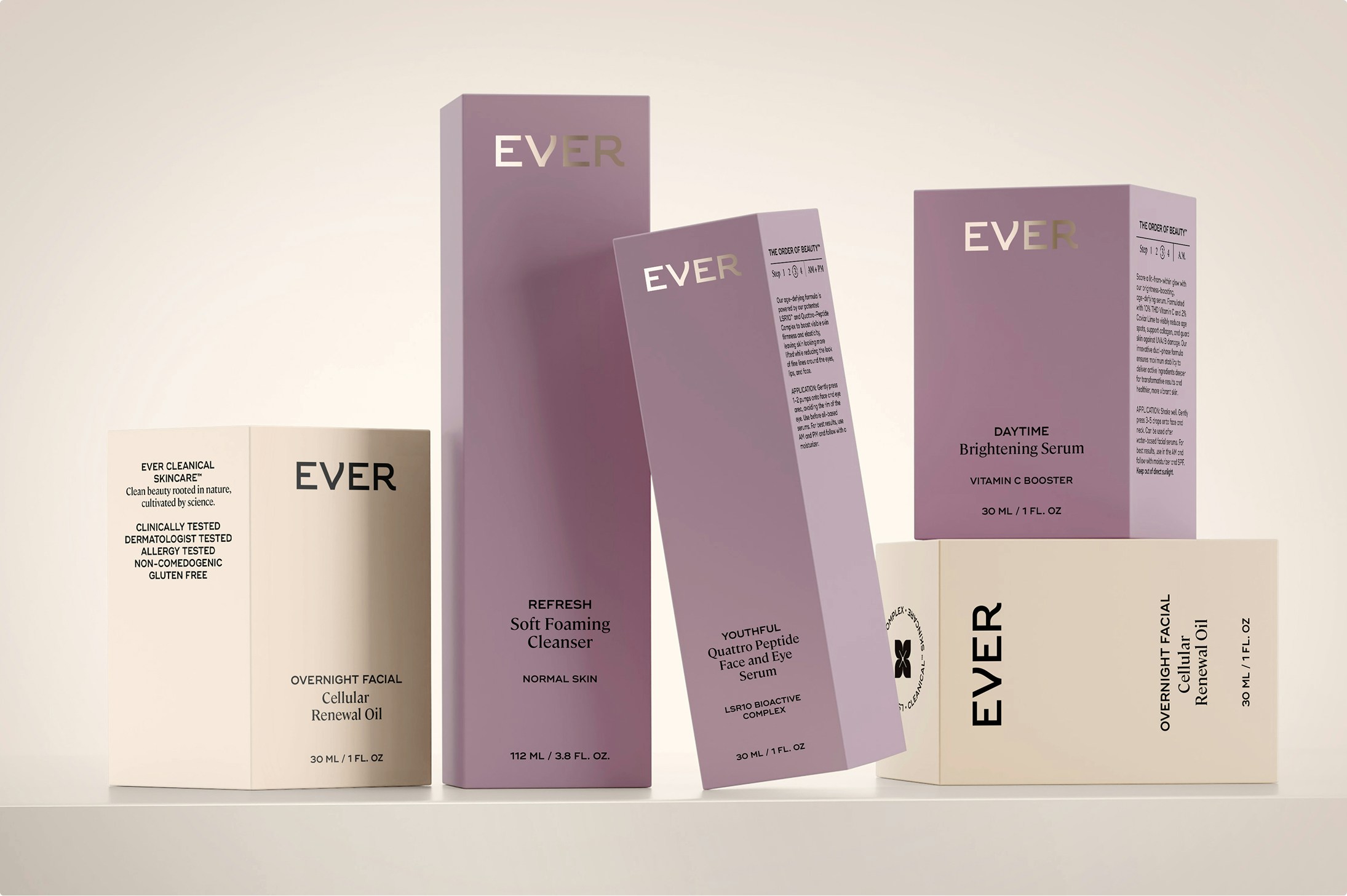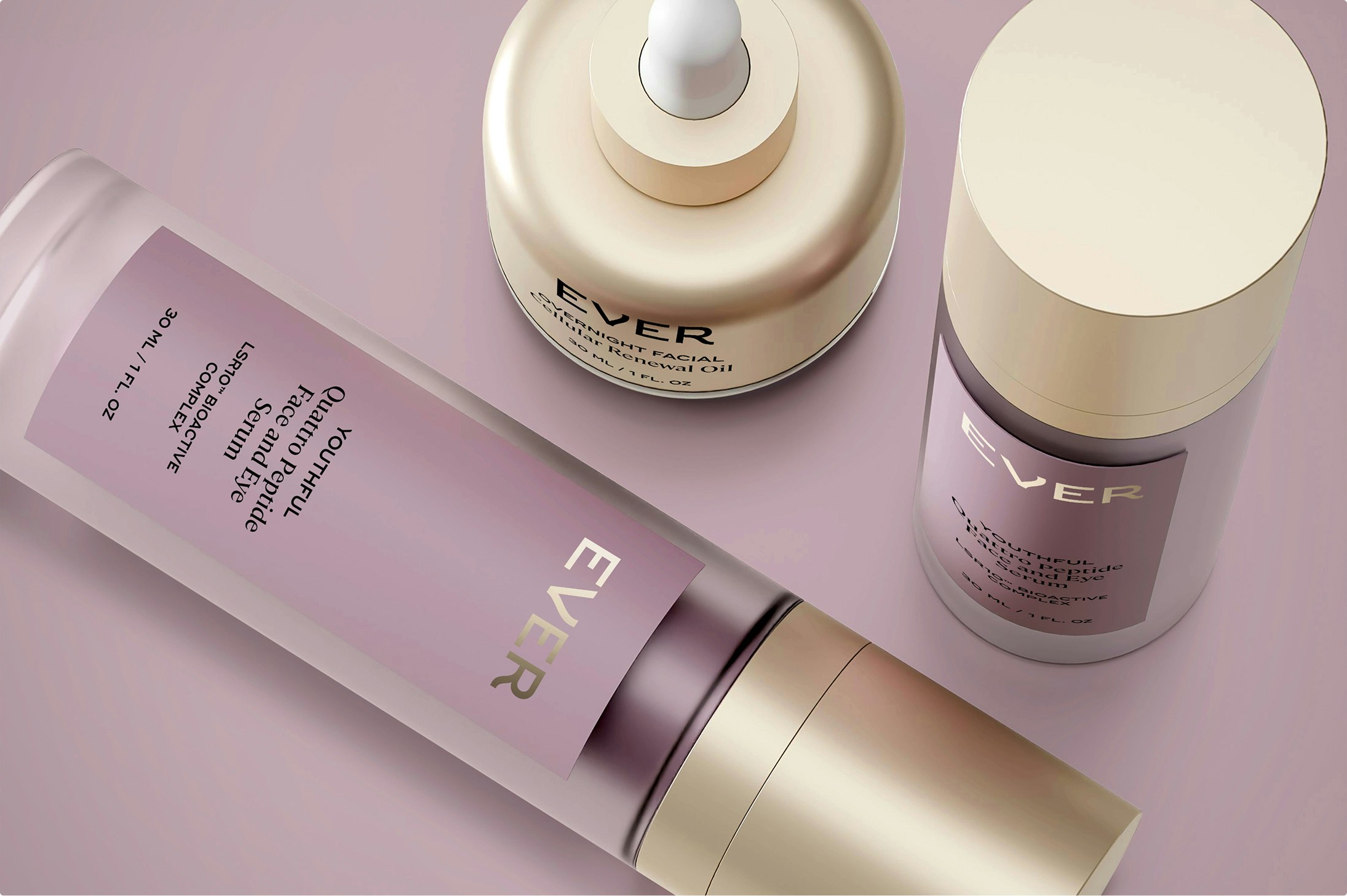 The color palette was updated to a muted, modern purple, a significant shift from the previous bright hue, better resonating with Ever’s core audience of women 40+. We also moved away from the overly botanical visual language, choosing instead to spotlight the camellia flower, both in photography and symbol, as a direct reference to the brand’s hero ingredient and scientific efficacy.The result is a brand identity that feels elevated, confident, and built to grow.